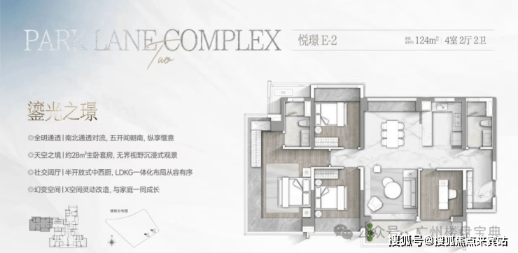 建面124平四房,可做横厅或者竖厅,还是南北对流,主卧带U型飘窗,两个次卧和客厅也有飘窗位,LDKG一体化设计,约28平奢阔主卧。
