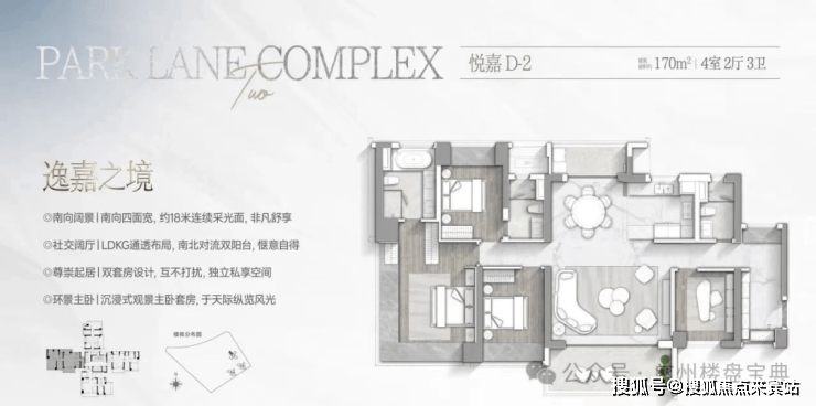 建面170平四房,三面采光,南向五开间,超60平的大客厅,南北对流双阳台,双主卧设计。
