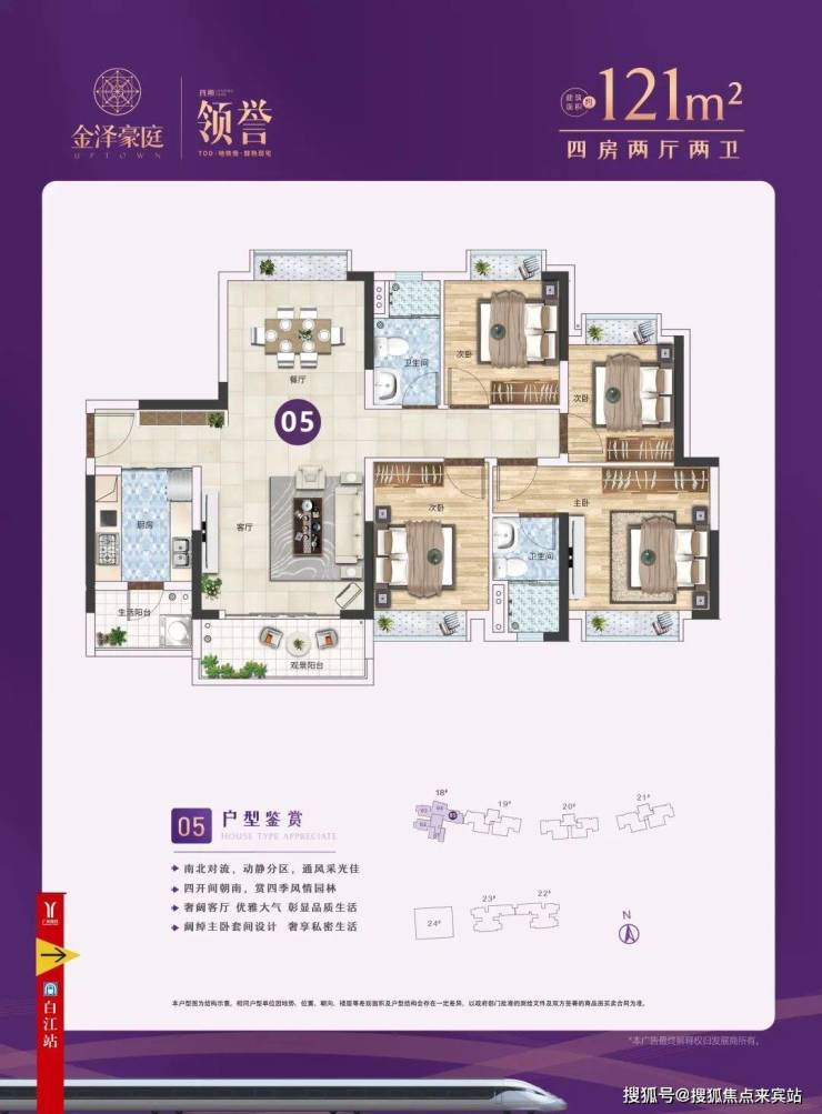 建面85-121㎡3-4房,首推18栋,约145套,85-89㎡三房两厅一卫、105㎡三房两厅两卫、121㎡四房两厅两卫。