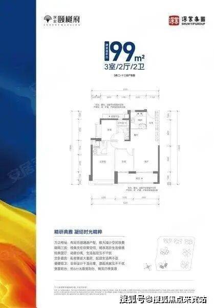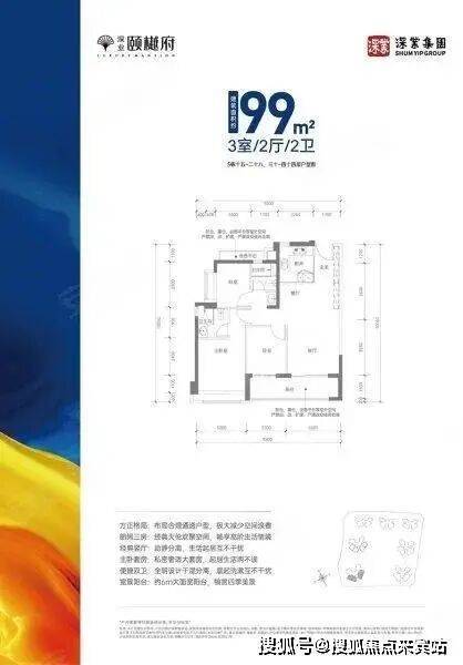 建面约99㎡三房两厅两卫:全南朝向,竖厅格局,三开间朝南,客厅连接次卧出6米长的大阳台,主卧套房设计,公卫三段式分离。