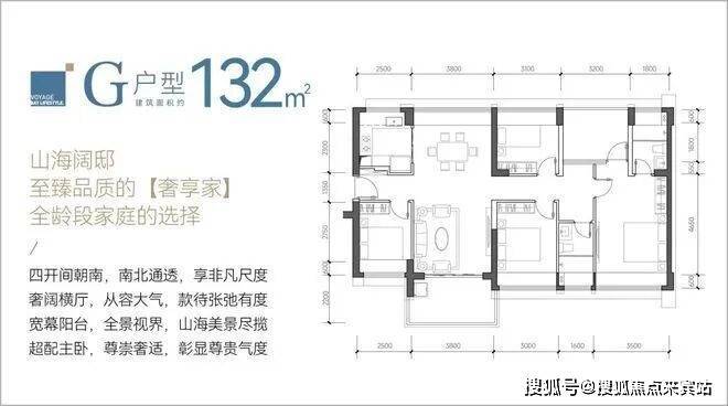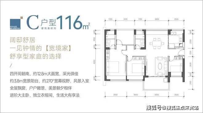 116㎡4房2卫C户型,竖厅南北通透格局,类似双龙抱珠,客厅3.8米开间,四开间朝南,阳台主朝西南、东南或正南向。