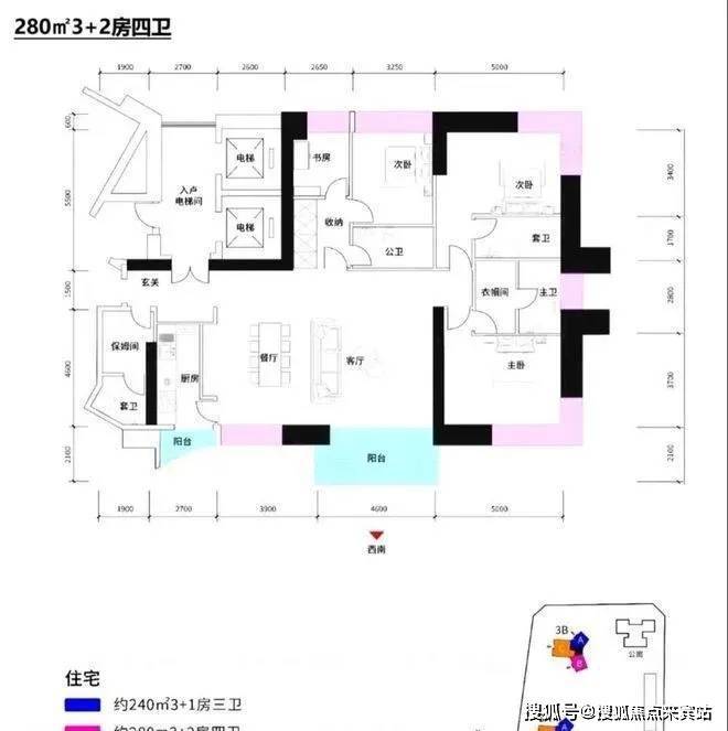 约280㎡4+1房4卫 B户型,西南朝向看城市景观,高层可看深圳湾海景;