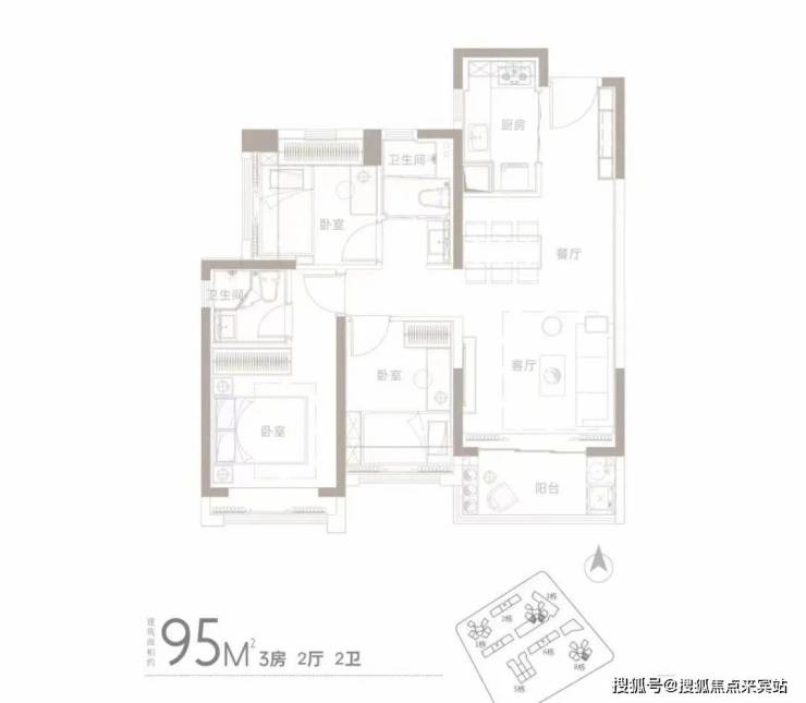 95㎡3房2厅2卫有横厅和竖厅两个格局,其中竖厅房源位于3栋和8栋,整体与83㎡相似;横厅位于1栋、3栋、8栋。