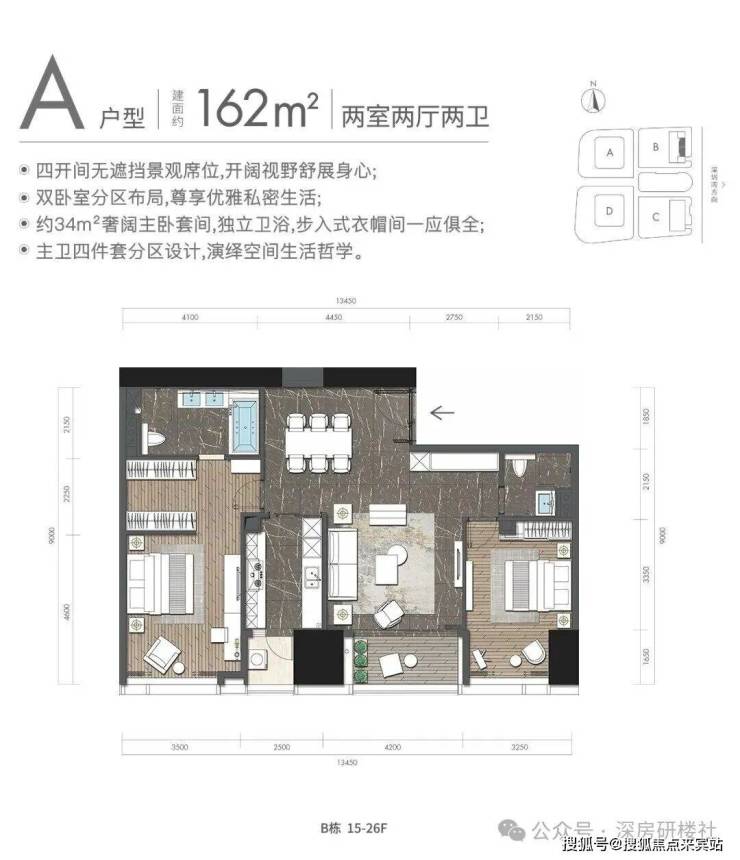 A户型:约162㎡2房2厅2卫:B栋15-26F(中区),东朝向