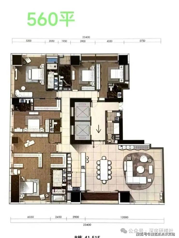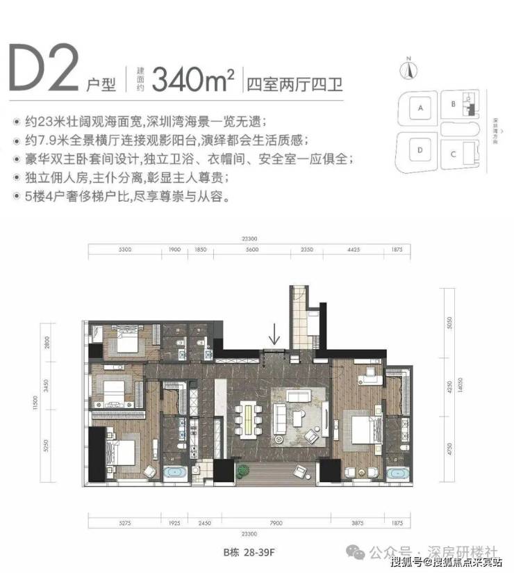 D2户型:约340㎡4房2厅4卫:B栋28-52F(高区),东朝向,户型与343㎡户型基本相同。