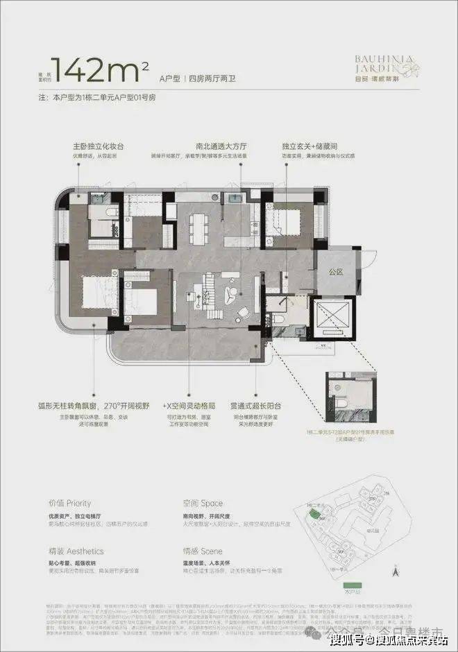 双龙抱珠户型,整个户型非常通透。书房分布于客厅另一侧,难得的双面采光+270°景观视野。主卧南北通透,景观面开阔。