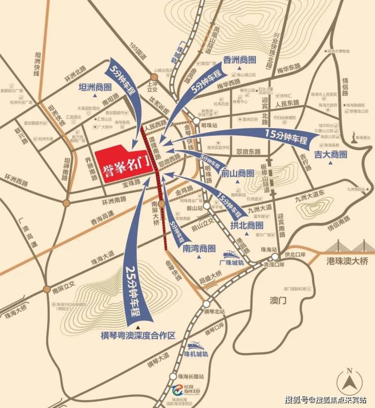 约5~15分钟车程可达珠海前山、拱北、吉大,以及坦北区域;