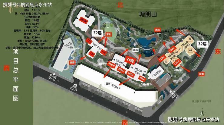 楼栋规划:4栋高层住宅及10户商业别墅,层高23-32层,主力户型层高3-3.6米。