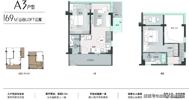 4.5 米层高,买一层送一层,大厅局部挑空,阳台赠送一半,入户花园全赠送,使用率超100%,全部温泉到户。