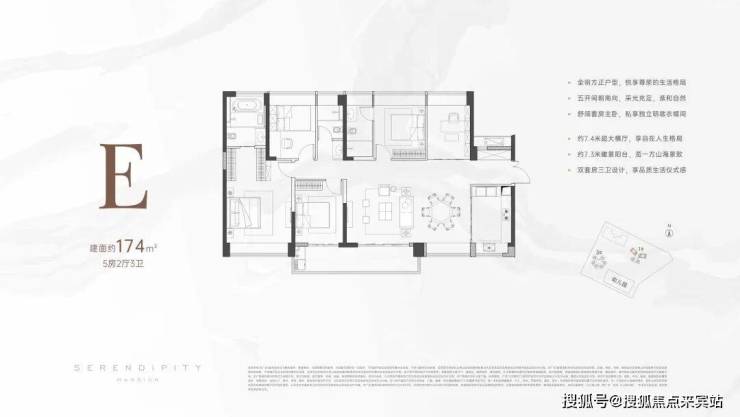 174㎡五房三卫双套间——7.3米大阳台、7.4米超大客餐一体化横厅、主卧4米超大开间,酒店式主卧套房带独立卫浴衣帽间,主开间全向朝南,双套房三卫设计,保证家人的私密起居