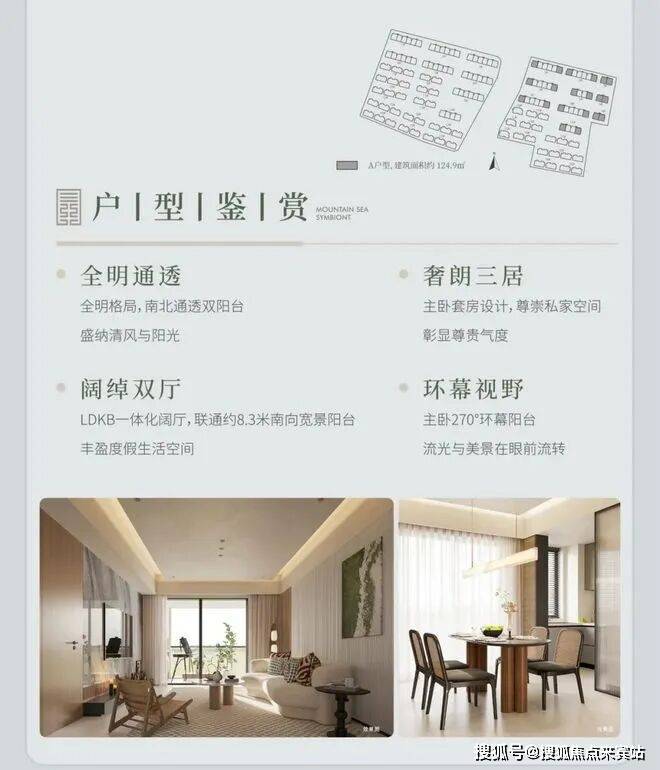 洋房 A 户型,建筑面积约 122㎡(或 124.9㎡ ),三室两厅两卫。全明通透,南北通透双阳台,主卧套房设计超有尊崇感。LDKB 一体化阔厅联通约 8.3 米南向宽景阳台,主卧还有 270° 环幕阳台,美景尽收眼底。