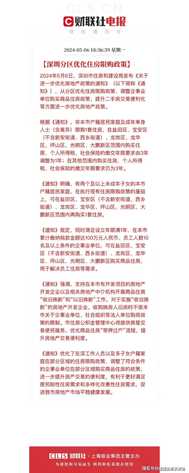 2024年5月6日,深圳市住房和建设局发布《关于进一步优化房地产政策的通知》(以下简称《通知》),从分区优化住房限购政策、调整企事业单位购买商品住房政策、提升二手房交易便利化等方面进一步优化房地产政策。