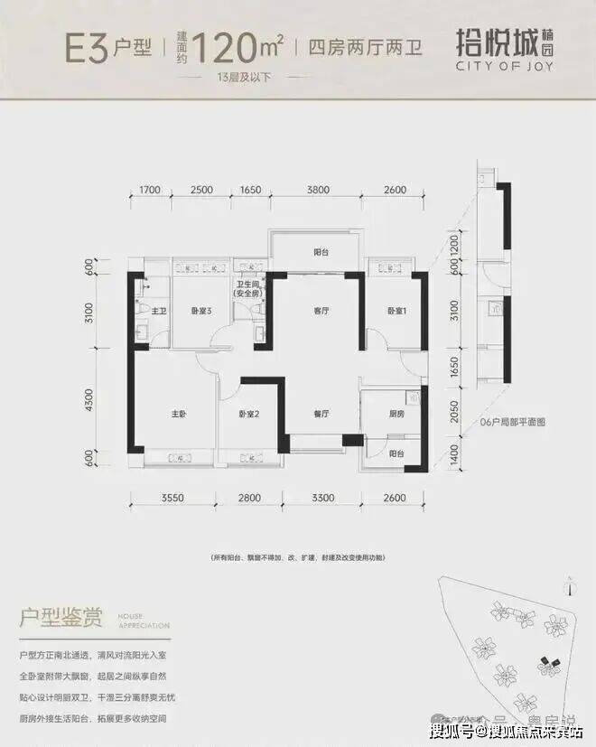 100平三房:设计的是竖厅格局,进门入户玄关,客厅3.4米开间,LDKB一体化设计,3个卧室分别做到了3米/2.9米/2.5米的宽度,U型厨房,公卫三段式分离,得房率:77.14%(不含赠送),阳台1.8米宽度,西南或东南朝向。