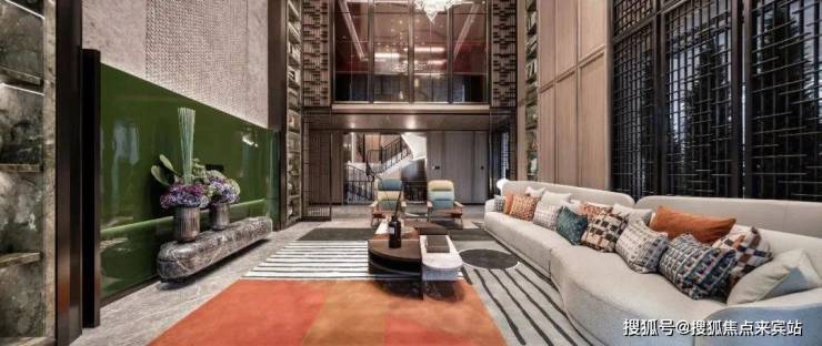 6.6米挑高山顶会客厅:十余米全景落地玻璃,将自然光线和南湖美景引入室内。华丽尺度与空间感相互融合,营造开阔视野;