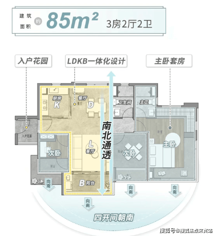 建面85㎡三房两卫B户型是五开间朝南格局,约14米南向大采光面,全屋南北通透,通风效果*