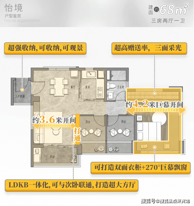建面68㎡三房一卫是刚需家庭高性价比选择,整体南北通透对流,3.6米开间客餐厅连通阳台,延伸室内空间感,不会显得局促