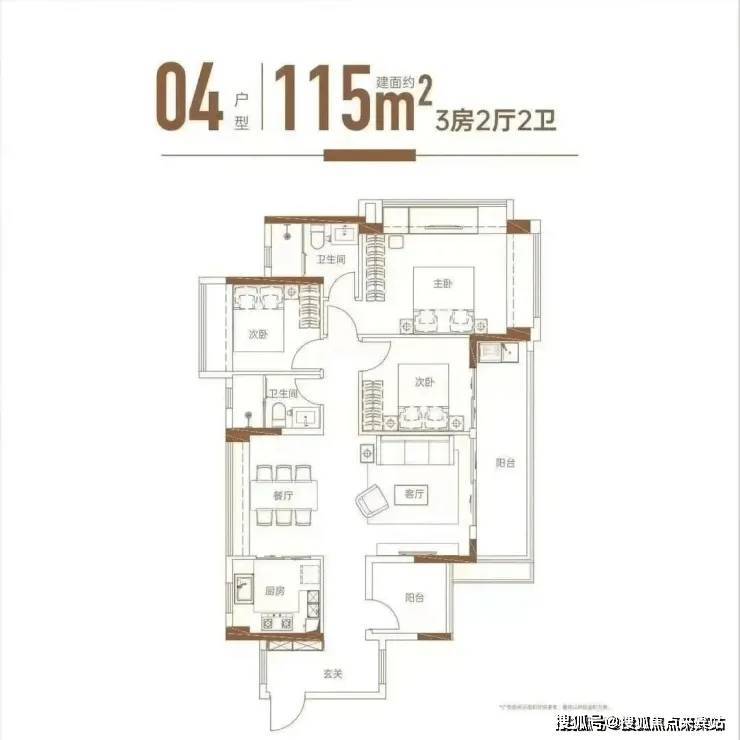建面约115平3+1房,南北通透,双跨阳台开间也有6米。主卧不仅有双面飘窗,还是三面采光的配置,整个空间通透明亮。
