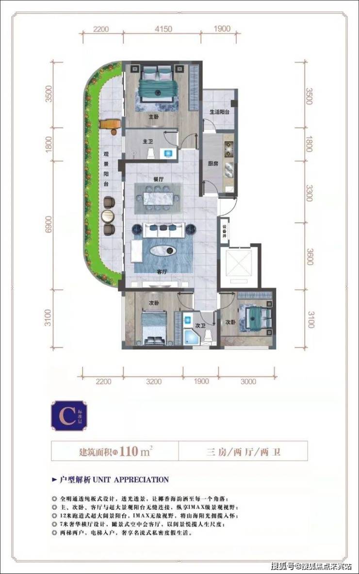🎏 C户型 三房两厅两卫双阳台建面约 110 ㎡,实得约 141 ㎡