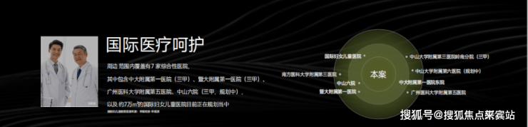 综合医疗资源:周边覆盖7家综合性医院,包括三甲医院中大附属第一医院、暨大附属第一医院等,中山六院及6.9万㎡国际妇女儿童医院(规划中)