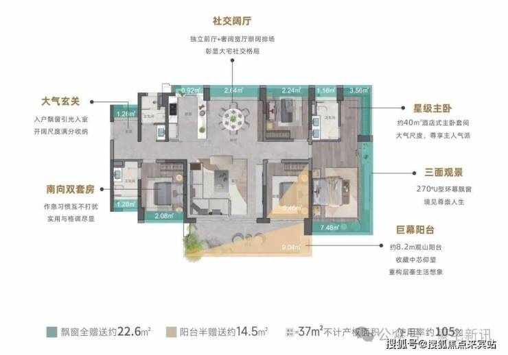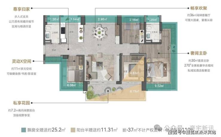 ②约30㎡酒店式主卧套房,享270°全景飘窗与独立衣帽间