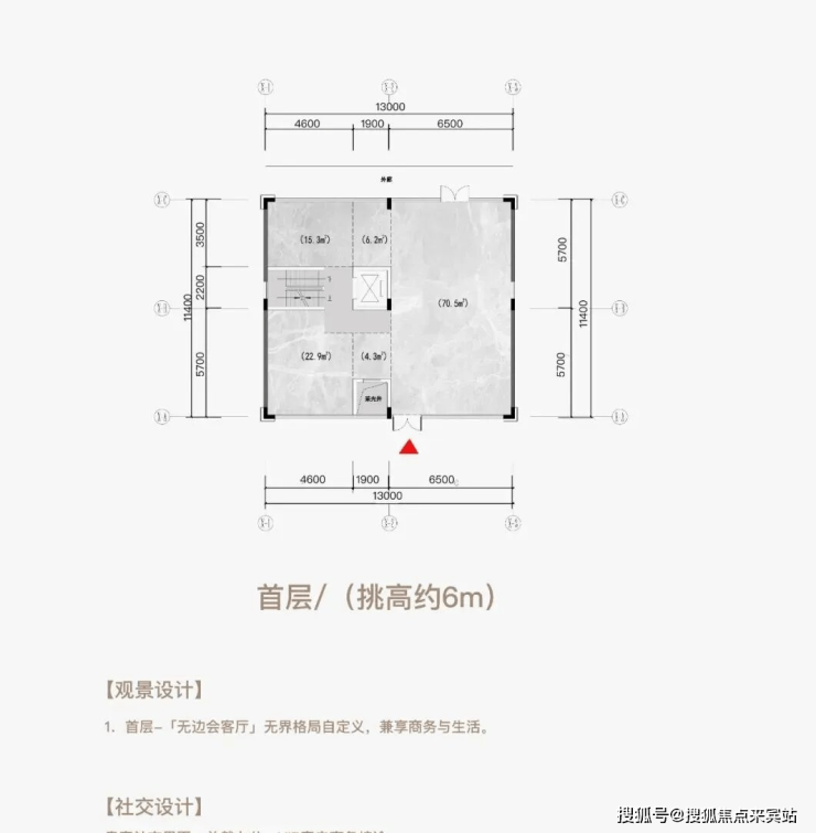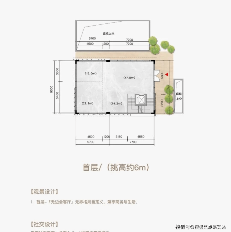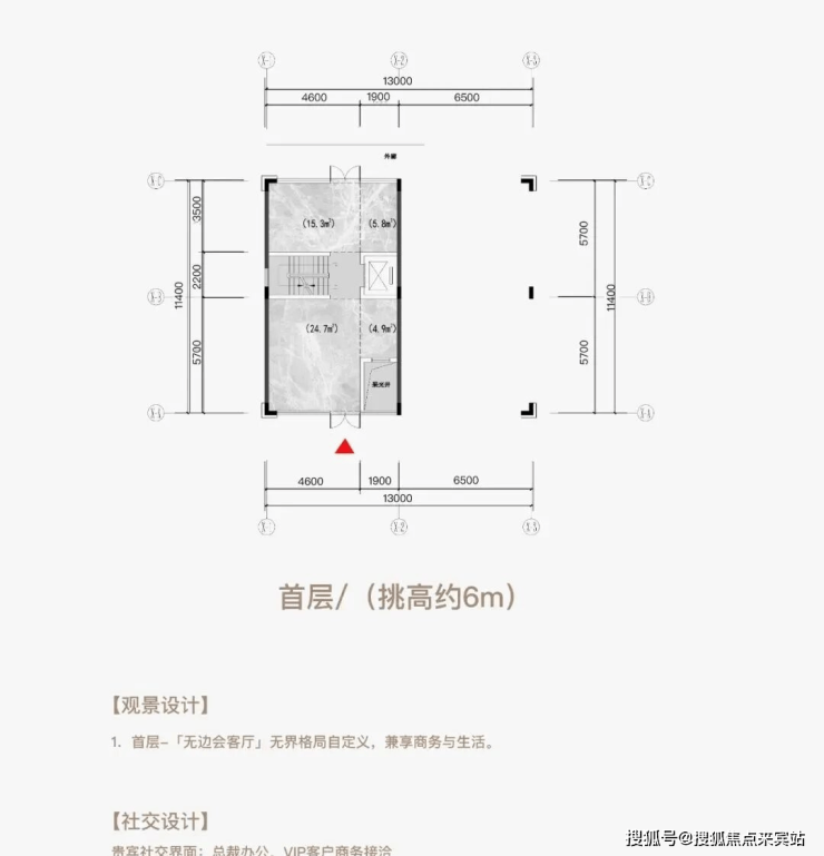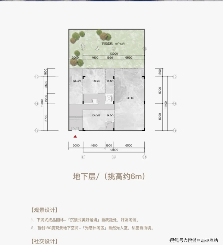 三层空间五个界面(顶层挑高约3m+首层挑高约6m+地下层挑高约6m)