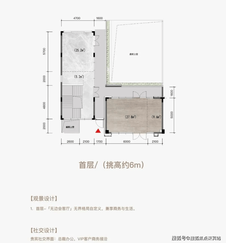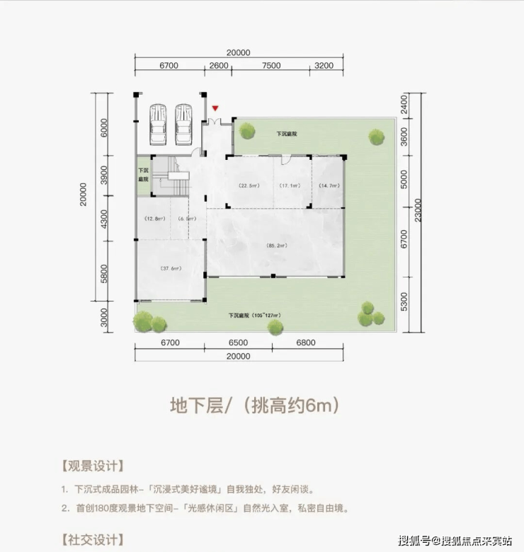 双层空间四个界面(首层挑高约6m+地下层挑高约6m)