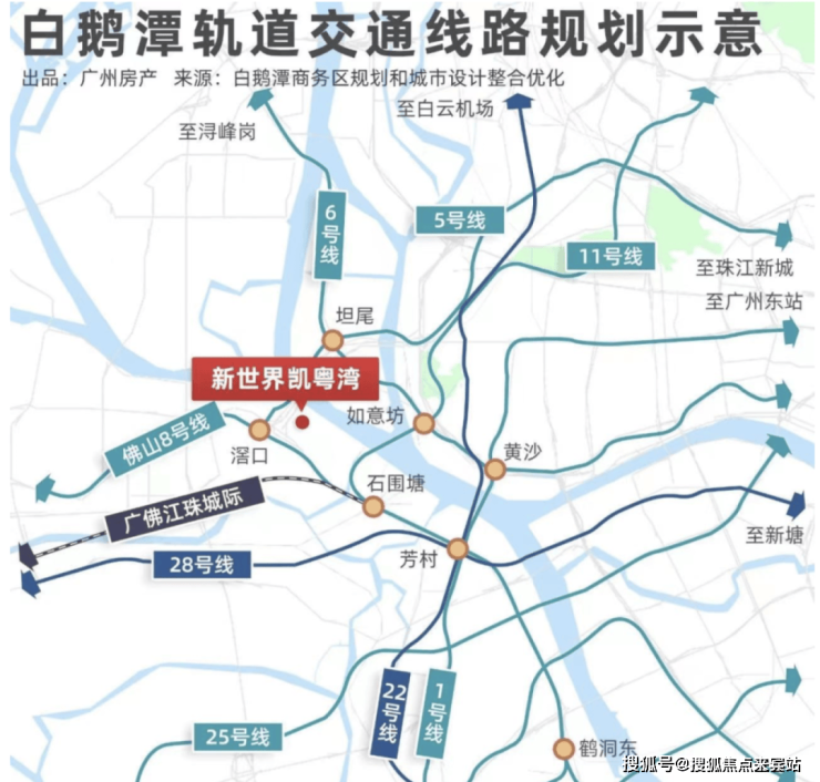 项目周边还有1、11、22、28号四地铁交汇的白鹅潭站,作为四线交汇站,随着11号线正式投入运营,新世界凯粤湾的业主将享受到更加便捷的交通网络,实现与广州其他区域的快速连接。