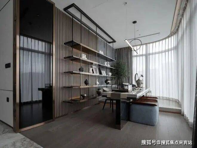 The study space along the curved glass curtain wall, above the skyline of the city skyscraper, forms a quiet sequence with minimalist composition and material details. High-definition stone and dark gray wood flooring set a calm tone, while metal grilles and suspended shelves form a light boundary. The design of light flows naturally from daytime to nighttime, carrying thoughts and making things silent. The desk looks at the city skyline, thinking in silence and hiding the sharpness in order.