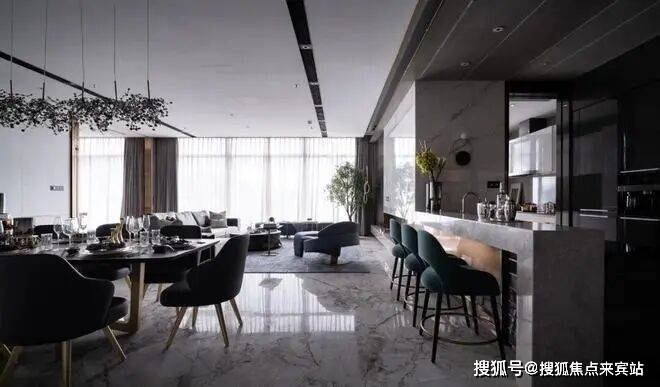 Light and shadow wander between the plush carpet and the floor-to-ceiling curtains, outlining a restrained but rich daily scene. Marble and metal materials are used to establish a sense of order in the space, and the combination of dark gray, stone white and ink blue creates a quiet atmosphere. The curved barstools and gallery chandelier soften the rational lines, while the grille and wine cooler behind the sofa extend the depth and fluidity of the space.