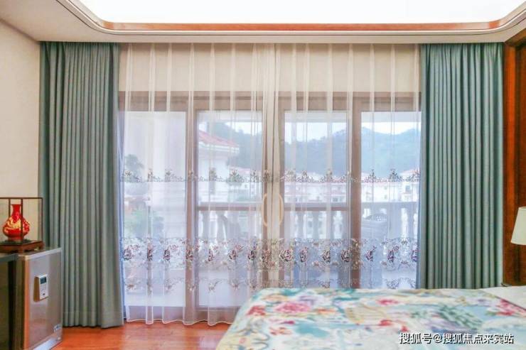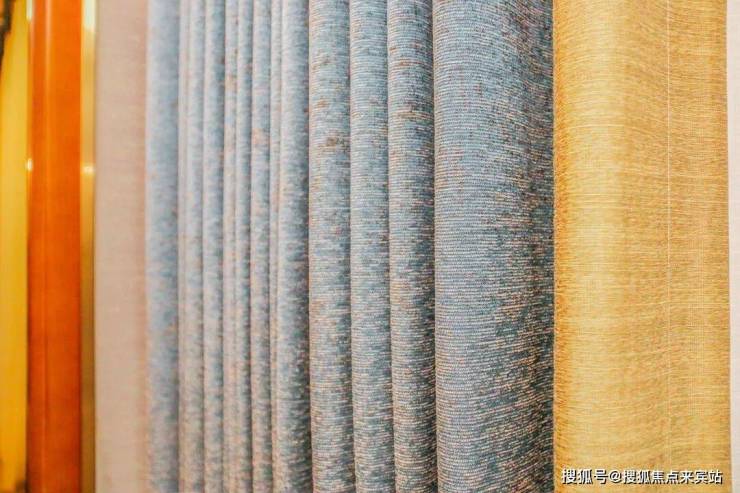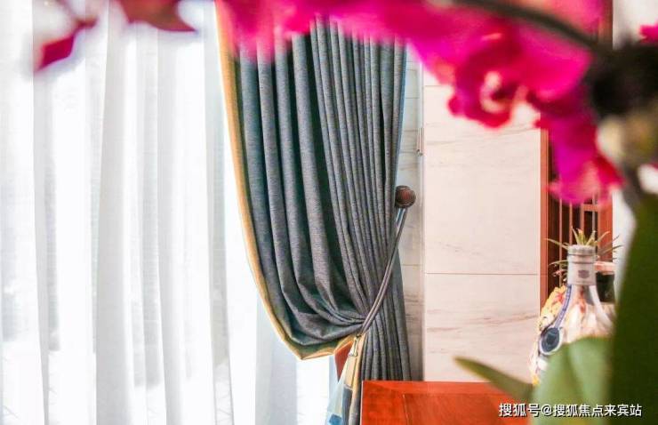在客厅窗帘颜色的搭配上选择与沙发坐垫和沙发背景的屏风色调一致,配布则用明黄色来提亮点缀空间。蓝色亚麻质感的窗帘,带有一丝灵动,也丰富了空间层次。整体空间颜色种类不多,互相呼应,因此显得格外协调。
