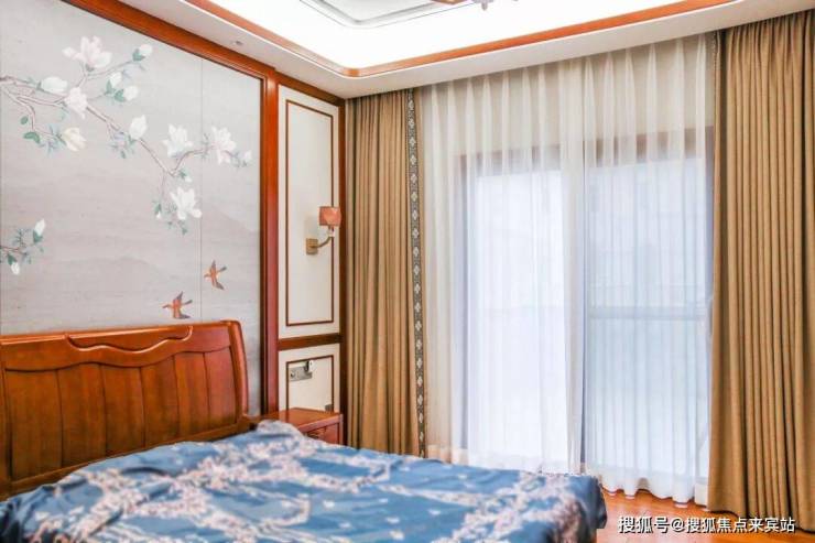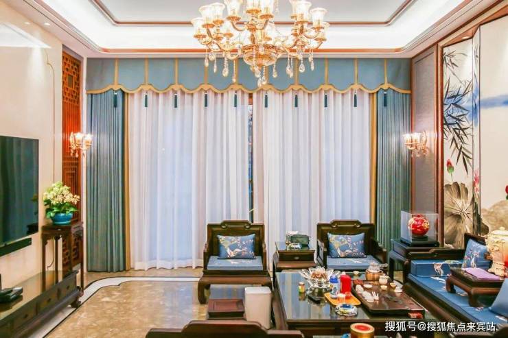 湖蓝色窗帘烘托出休闲厅深邃的大气之感,体现自由的生活理念。米黄色的背景墙采用双宫丝的材质,自然的纹理展现了中式典雅的韵味。放眼望去,休闲厅虽没有名贵之物,却给人古典尊贵之感。