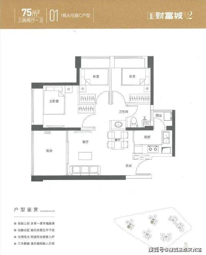 ✅ 75㎡三房:188万起(单价约2.51万/㎡)