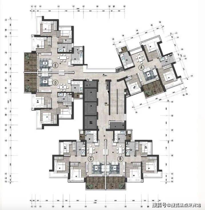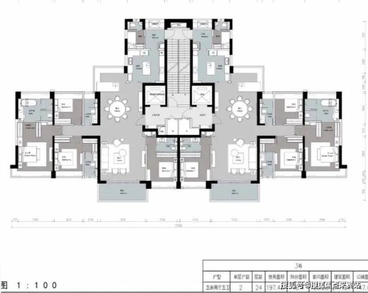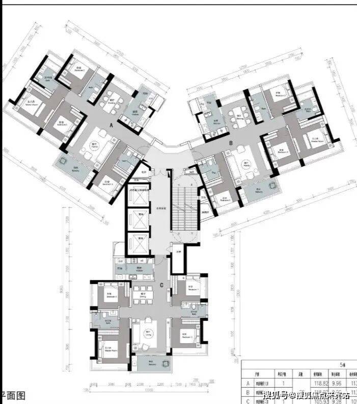 5栋为两个单元,均为三梯三户,分别是160平的四房以及143平的四房,160平户型南北通透,143平双龙抱珠,均为非常优质的户型,层高3.15米,总高42层,架空2层。