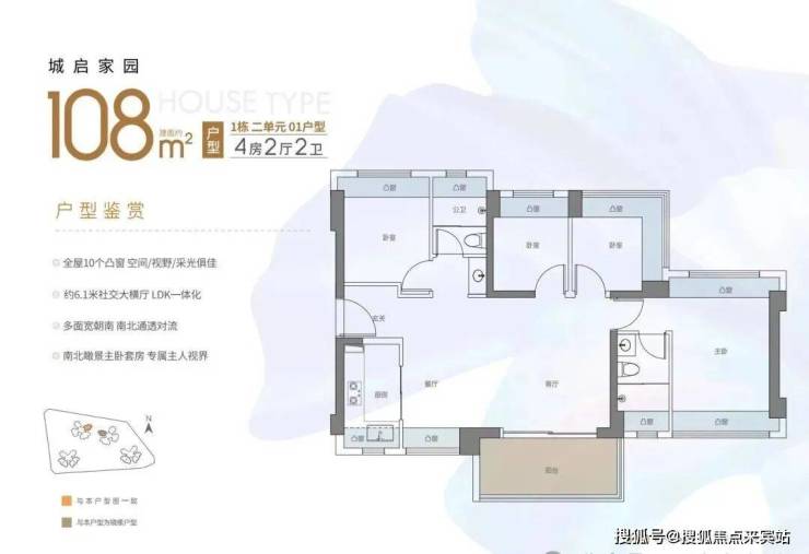 108㎡的4房2厅2卫:横厅南北通透格局,进门独立玄关,客餐厅6.1米开间,LDKB一体化,五开间朝南,主卧双飘窗通透设计,全屋10个凸窗,L型厨房,卫生间干湿分离,得房率约90%(包含赠送),阳台主朝西南或东南向。