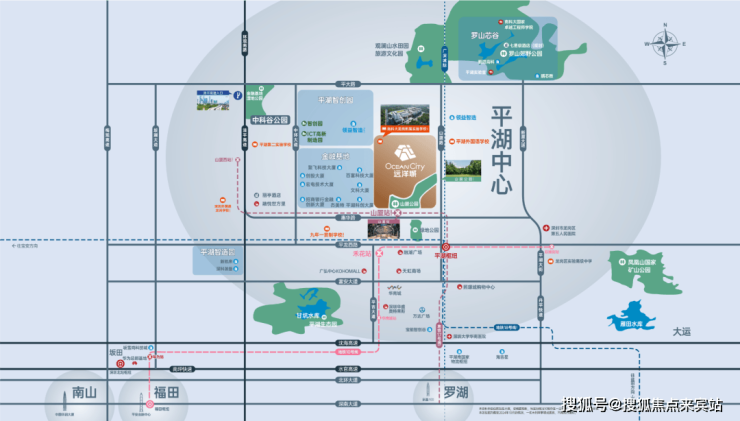 远洋城,位于龙岗区平湖街道山厦路与惠华路交汇处,项目东侧紧挨广深铁路,西侧靠近平湖全球金融产业服务基地,该基地总规划2.24平方公里,总建筑规模约380万平方米,共分三期开发,目前一期总规划用地90万平方米,在该园区可以享受低成本低价补贴、注册公司优惠政策、园区固投补贴、融资贴息补贴、科创基地、人才政策等一系列优待措施。