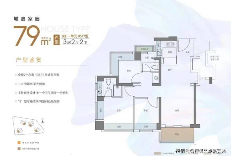 79㎡的3房2厅2卫,设计的是经典竖厅格局,LDKB一体化,S墙设计预留冰箱卡槽位,动静分区,三开间朝南,主卧+1个次卧270°飘窗设计,U型厨房,公卫三段式分离,得房率约90%(包含赠送),东南或西南朝向。