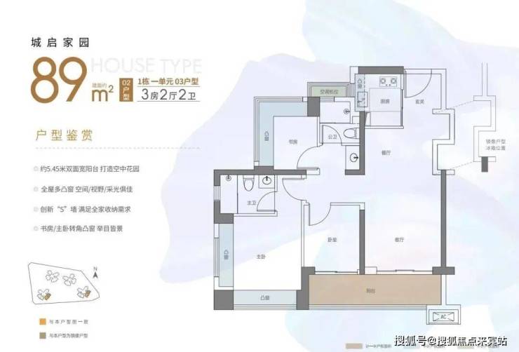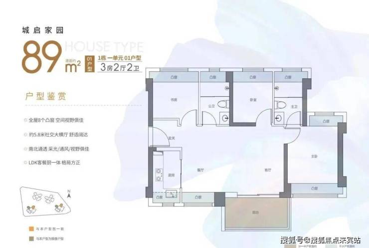 89㎡的3房2厅2卫经典竖厅格局,LDKB一体化,S墙设计预留冰箱卡槽位,动静分区,三开间朝南,主卧+1个次卧270°飘窗设计,U型厨房,公卫三段式分离,客厅连接卧室出5.45米长的大阳台,得房率约90%(包含赠送),东南朝向。