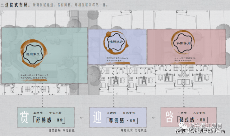无门仪,不成门第,唯三进礼序,方显世家风度。礼是名门世家居住哲学的第一道讲究,序是尊贵姿态中不可或缺的贵族风范。论语曰“登堂入室为贵胄也”,回顾历史长河,无论是皇家园林或是名门私院,皆以“礼”为制,鸿升春江明月三进式院落,层层礼序,演绎中国门第之尊。