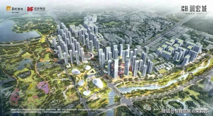 华润润宏城,由华润+宏发集团联合打造,总占地面积51.73万㎡,计容建筑面积约327.45万㎡,综合容积率6.3,共分24个地块开发,其中12个地块打造产业园区,12个地块打造高档住宅小区,小区共分2期多个地块分批建设,其中住宅面积152.47万㎡(含可售人才房20.49万㎡)。