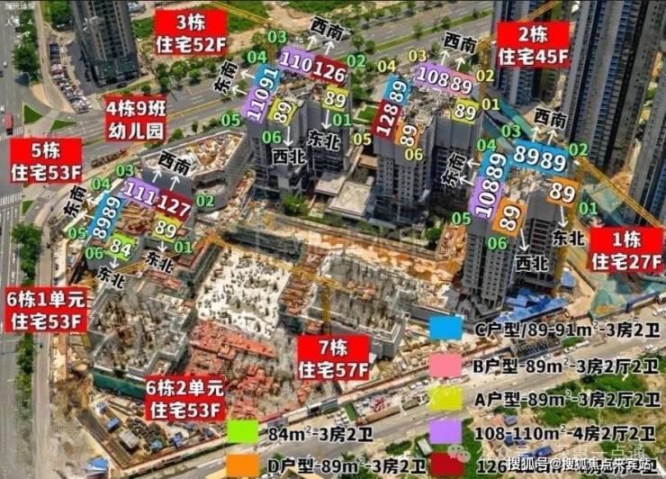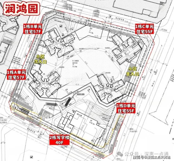 后面要入市的润鸿园,总占地面积约2.1万㎡,总建筑面积约25.97万㎡,计容建筑面积约19.3万㎡,容积率8.33,绿化率30.01%,共由4栋总高55-57层高的住宅组成,其中1栋A/B单元住宅57F,1栋C/D单元住宅55F,2栋是写字楼40F,是独立于小区之外的。