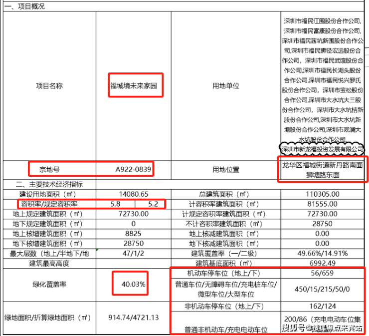 通过公开的信息,我们可以知道项目住宅一期备案名为:福城境未来家园,是龙华A922-0839宗地,位置龙华区福城街道新丹路南面狮塘路东南,绿化约40.03%,容积率:5.8/5.2,总户数675户,车位比1:1以上。