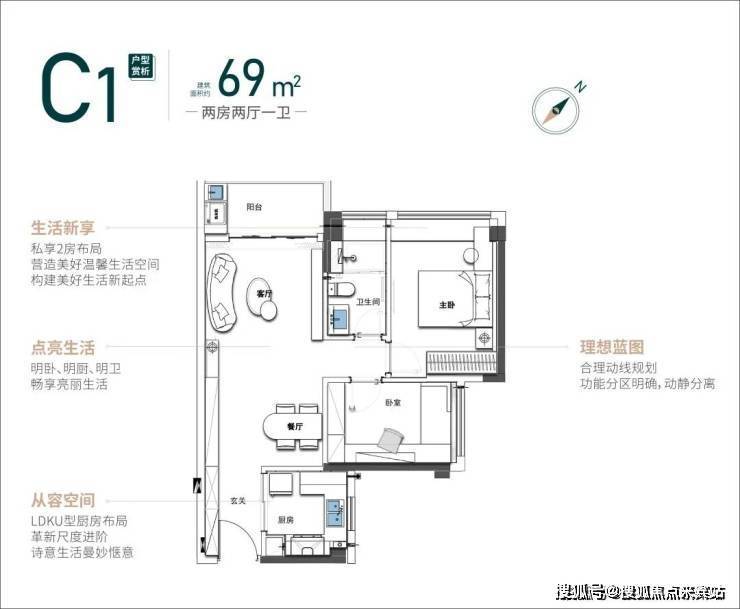 (1)69㎡两房一卫:精装总价约152万起,适合首次购房者,朝向以东南、西南为主