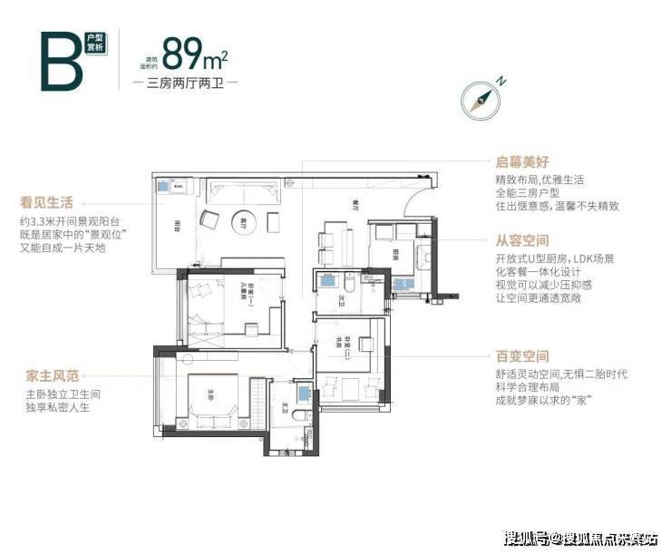 (2)89㎡三房两卫:精装总价195万起,户型包含三室两厅两卫等配置,朝向以东南、西南为主。