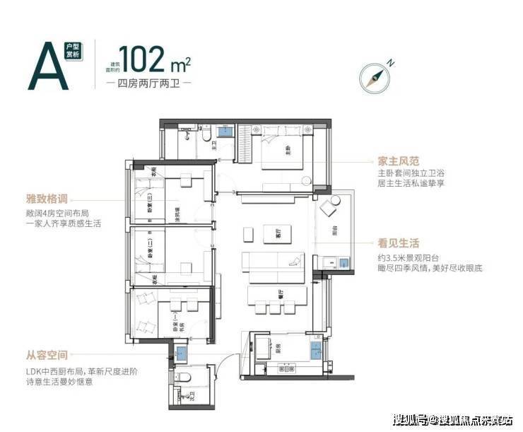 (2)101㎡四房:精装总价222万起,户型包含四室两厅两卫等配置,朝向以东南、西南为主。