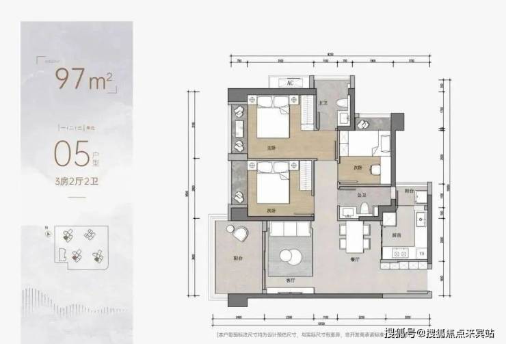 3房为97平3房2卫的户型