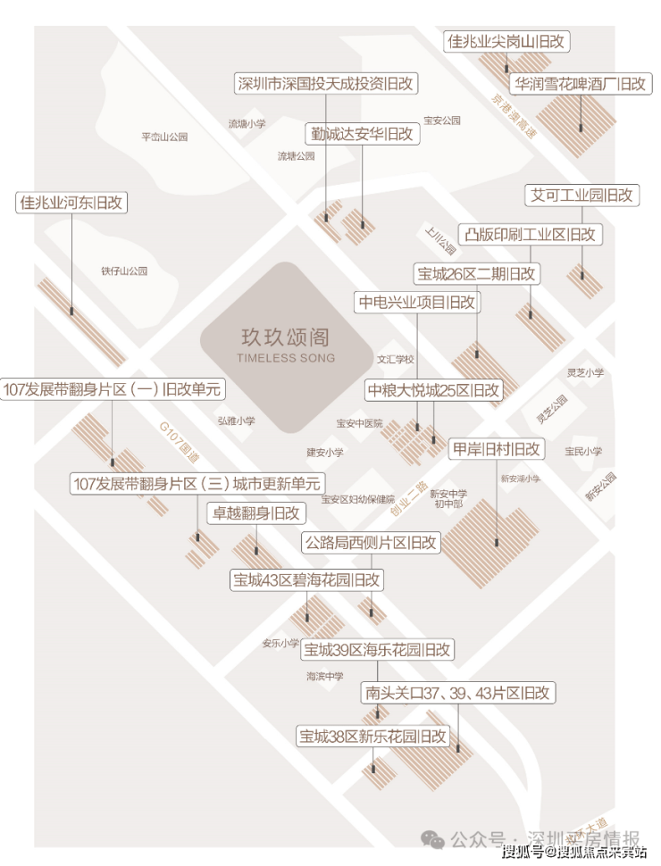 玖玖颂阁位于深圳市宝安区新安街道新安四路与建安一路交汇处,与招商臻府相邻。属于新安老城区,距离在建地铁12号线上川站约有800米的距离,与5号线灵芝站、15号线(在建中)流塘站距离较近,可一站换乘。玖玖颂阁和招商臻府原属于宝城34-2片区城市更新,深圳买房选杨帆,该旧改于2015年被纳入城市更新单元第三批计划,原拆除用地范围4万㎡,开发建设用地3.4万㎡,计容积率总建面16.9万㎡。
