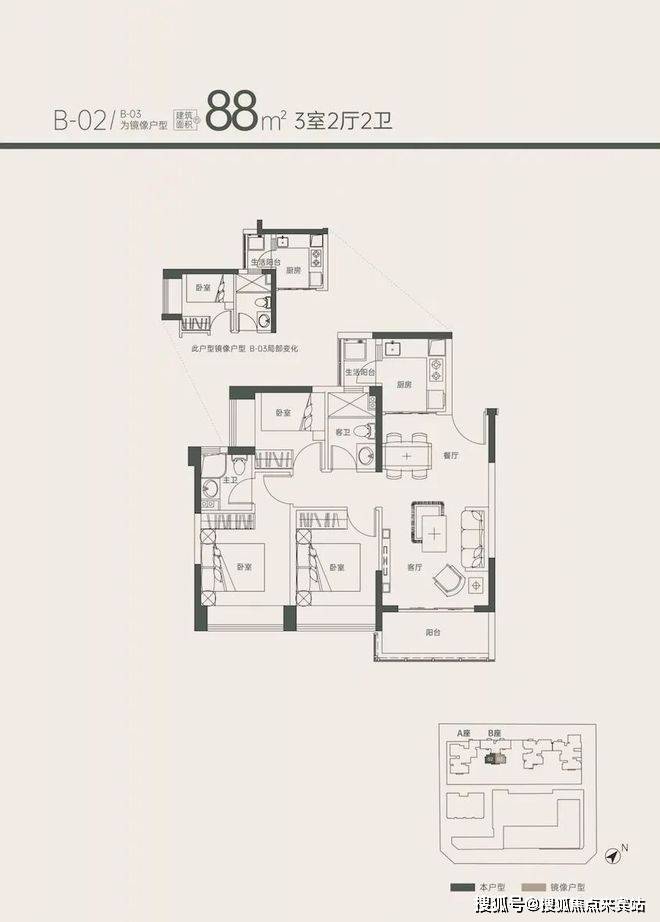 位于1B座是两梯四户的格局,尺度感不亚于目前市面上95㎡的产品。