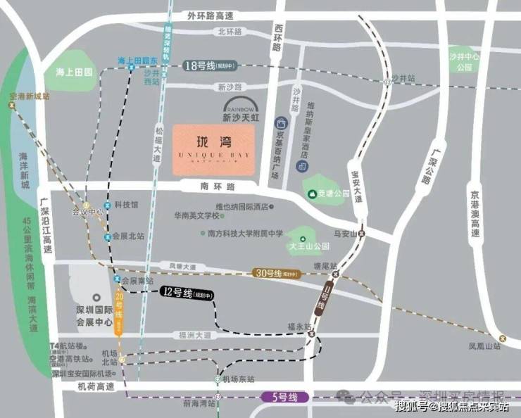 陆:周边有“一横三纵+三大高速”的交通路网,从项目出发经南环路接沿江高速约15分钟到前海,约20分钟到南山。另有宝安大道、107国道、京港澳高速,外环高速多条线路,约7分钟直达国际会展城及海洋新城