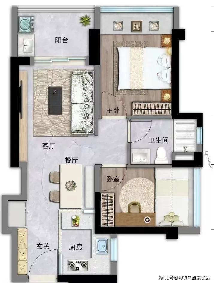 约63㎡2房2厅1卫:竖厅设计,进门入户玄关,S墙设计预留冰箱位,U型厨房,餐客厅一体连接阳台,卫生间干湿分离,阳台西北朝向。