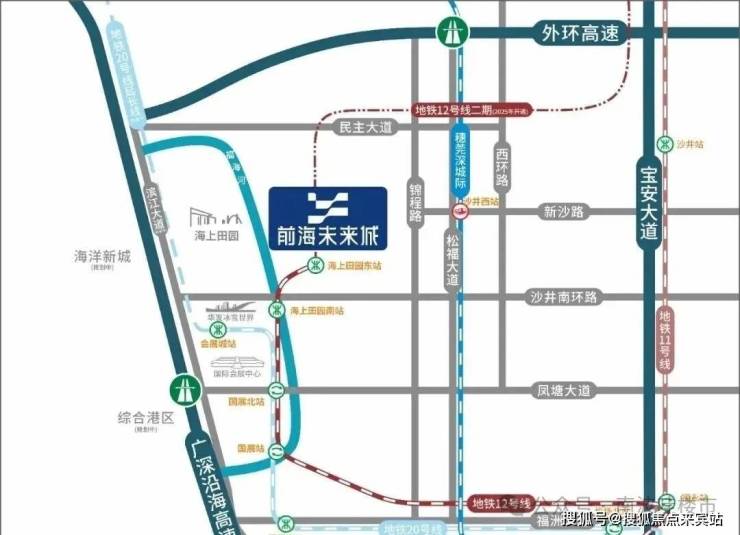 蔚蓝海尚位于整个项目的东北角,地块呈梯形,家门口就是12号地铁线“海上田园东站”,一期是最靠近地铁站的,2站到国展北站可以换乘20号线,6站到福永站还可以换乘11号线,快速通达宝中,南山区。